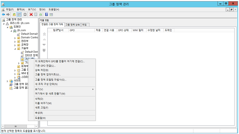 그룹 정책 관리로 가서 기술부에 GPO를 연결한다.