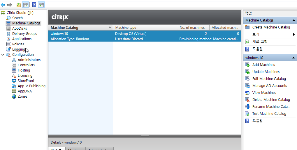 준비가 끝나면 머신 카탈로그 바탕에 생성된 windows10의 머신 카탈로그를 볼 수 있다.