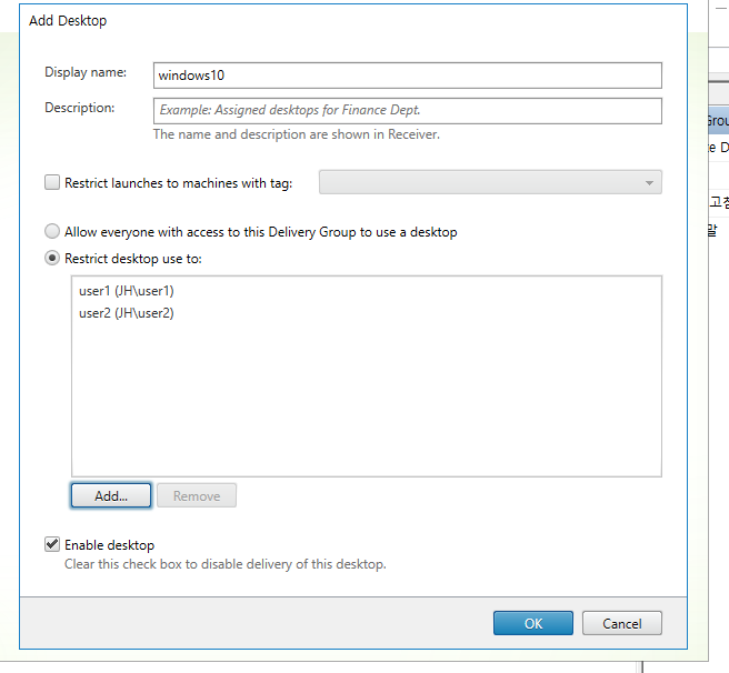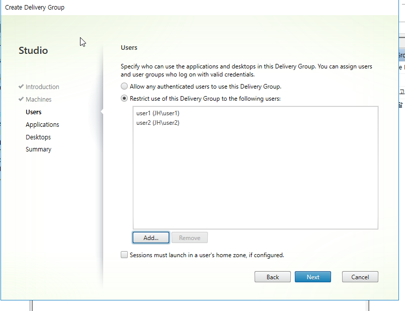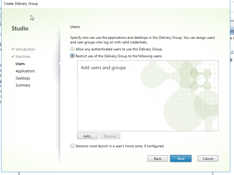 AD 서버에서 Delivery Group 사용자를 만들었기 때문에 add 누르고