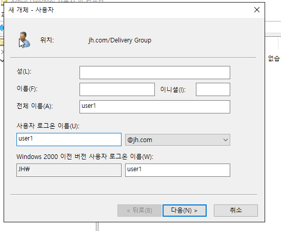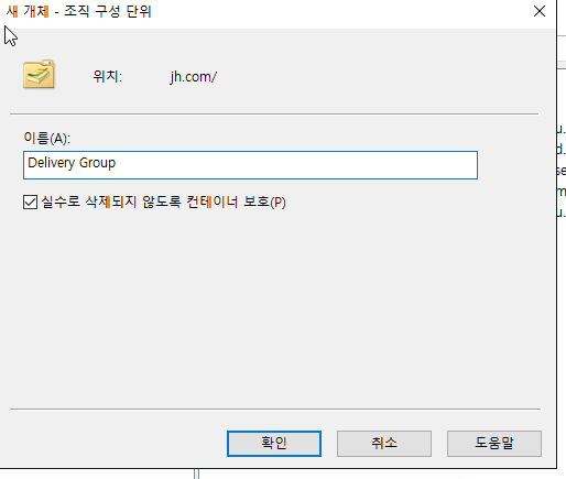 도메인 -> 오른쪽 마우스 클릭 -> 새로만들기 -> 조직구성단위(폴더)