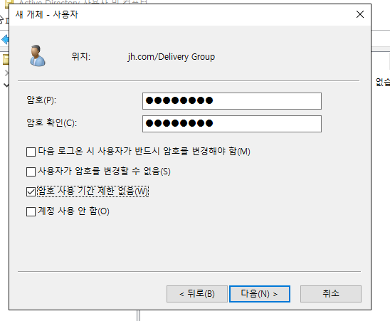 패스워드 입력-> 암호 사용 기간 제한 없음 -> 다음