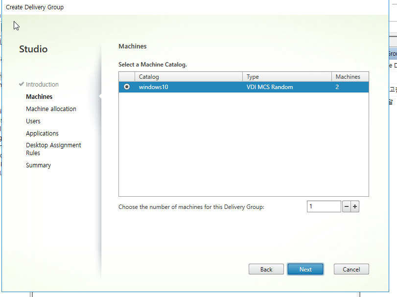 전에 만든 카탈로그를 선택하고 Delivery group 에 할당 할 컴퓨터 카탈로그에서 컴퓨터 수를 선택합니다. 다음 클릭