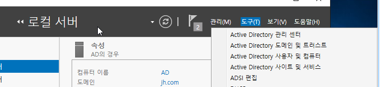 서버관리자 -> 도구-> Active Directory 사용자 및 컴퓨터