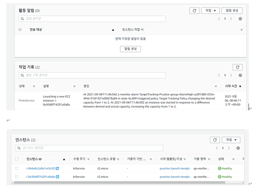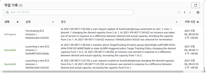 활동 기록 탭을 클릭하면 cpu 사용률 증가로 인해 인스턴스 수가 1대에서 2대로 늘어갔다는 이력이 생겼다.