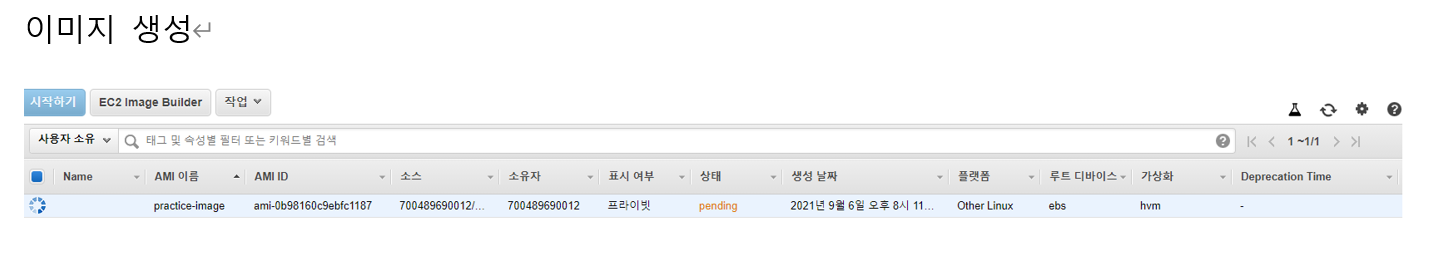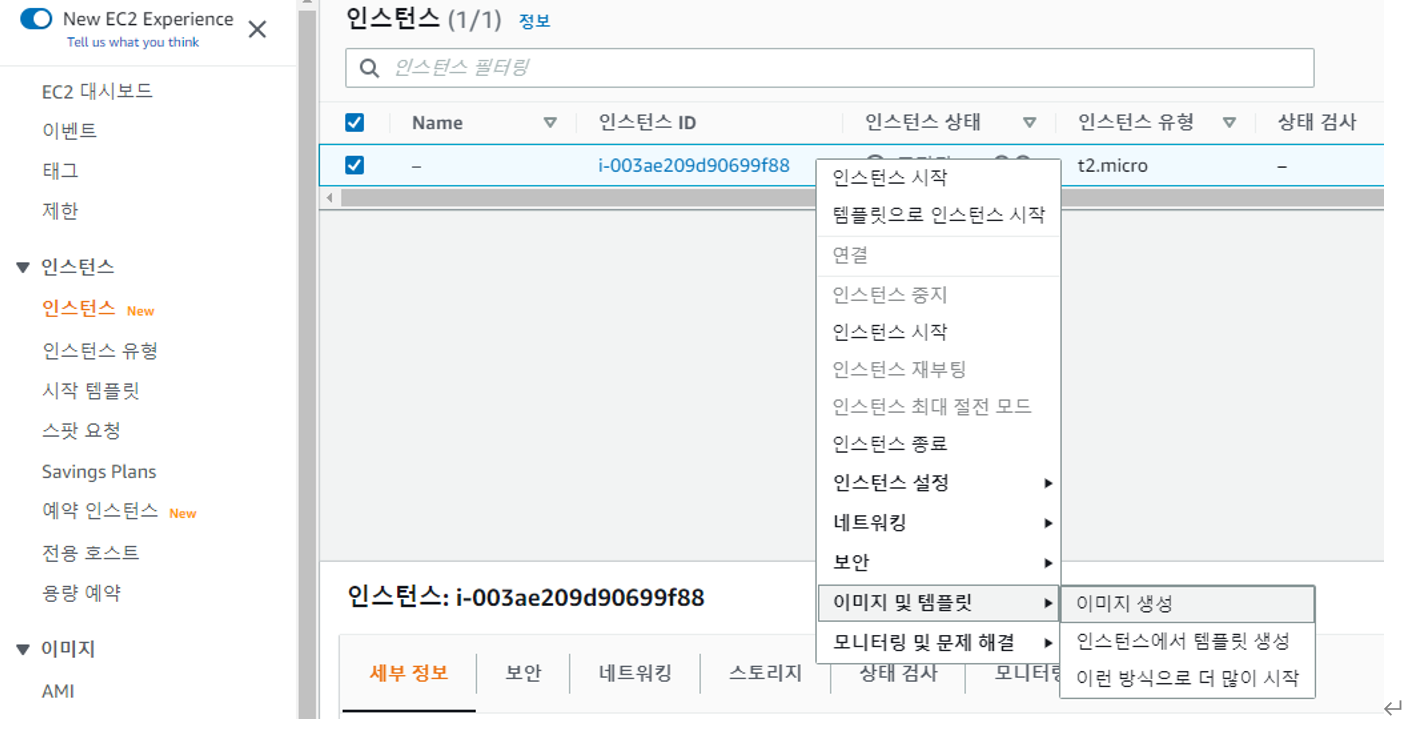 이미지(AMI) 생성 (인스턴스는 반드시 중지상태)