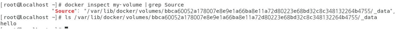 inspect 명령어로 my-volume 컨테이너의 데이터 볼륨경로 확인 ,앞에 생성한 hello 파일이 보인다.