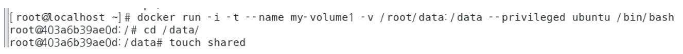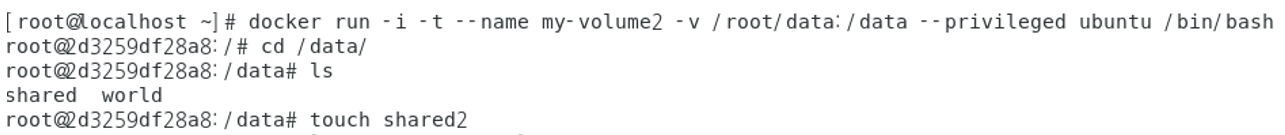 docker run -i -t --name my-volume2 -v /root/data:/data --privileged ubuntu /bin/bash