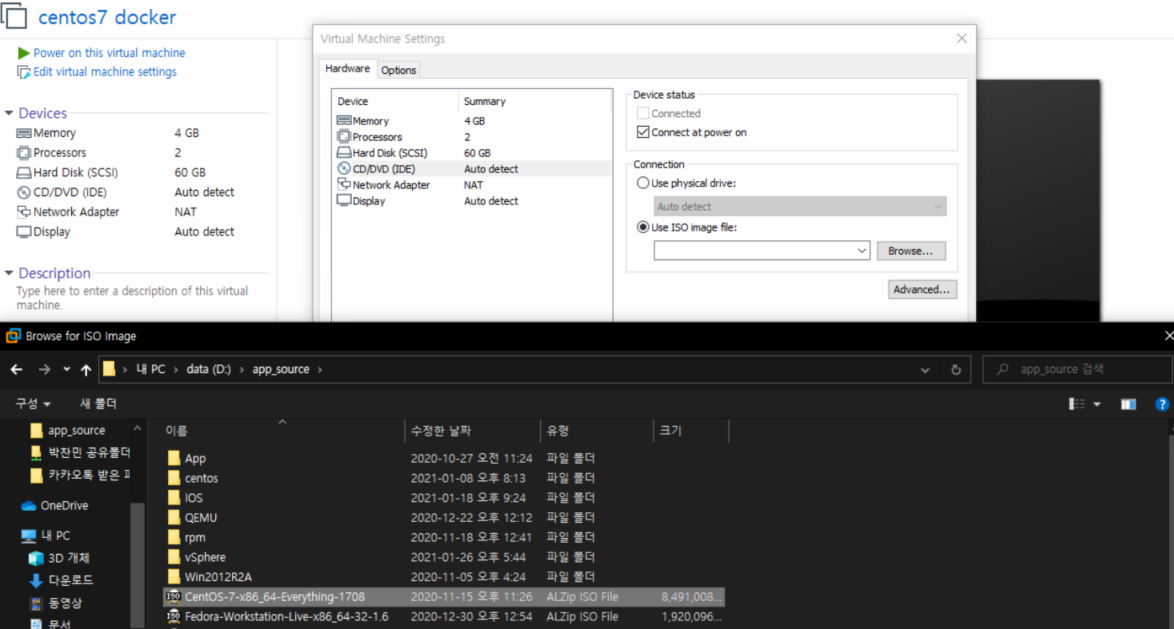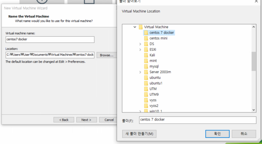 먼저 centos 7 docker 라는 폴더를 만들고 폴더 선택후 가상머신의 이름도 똑같이 centos 7 docker 라고 지정해준다. 이름은 사용자 마음대로 주어도 상관없다.