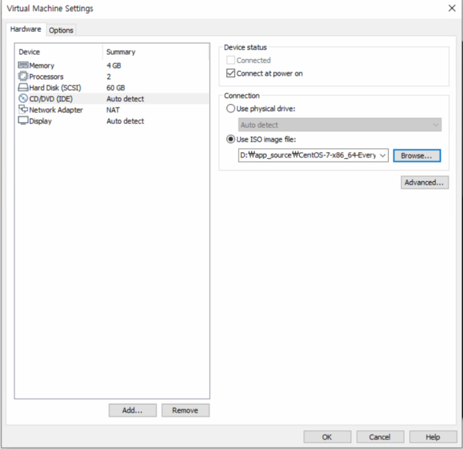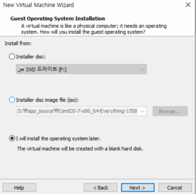 centos 7 64bit iso 파일을 다운받은 경로 로 선택한다.