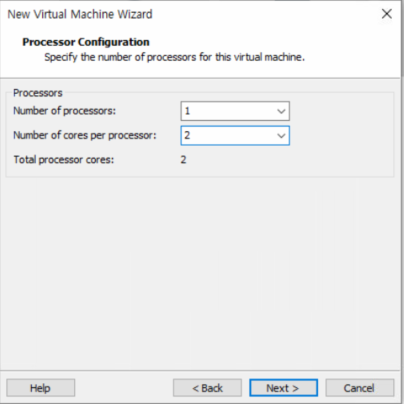 프로세서의 개수를 선택하라는데 사용자 cpu 코어 갯수와 vmware 앞으로 여대러대 가상머신을 쓰기위해 저는 1 , 2 로 선택 했습니다.