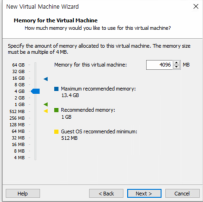 메모리는 16기가를 사용하신다면 4기가를 추천하고 8기가 이하면 최소 1기가 이상 설정 해야 합니다.