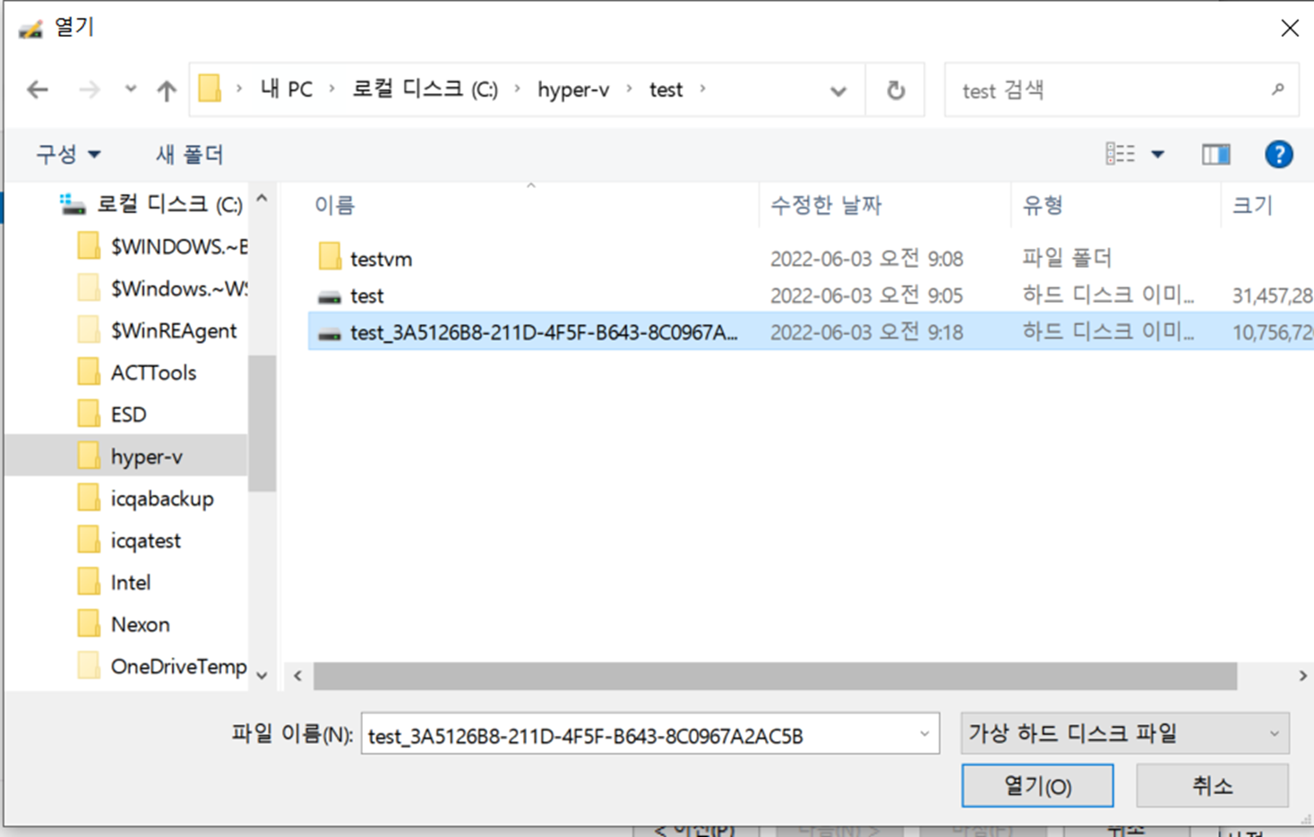 여기서 아까 VHD 디스크를 생성한 경로로 가서 마운트 시켜준다.