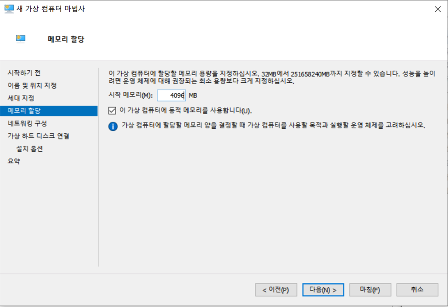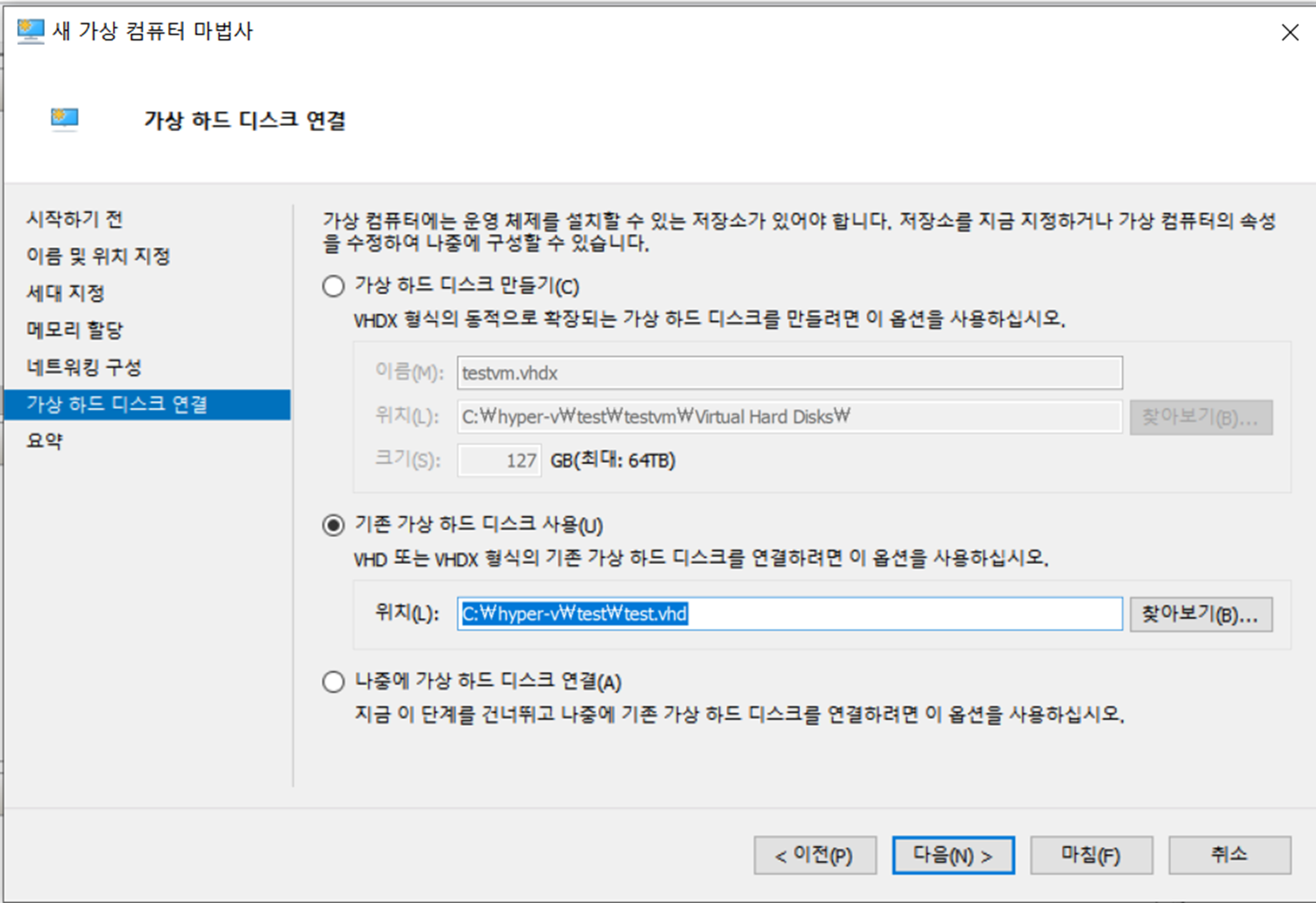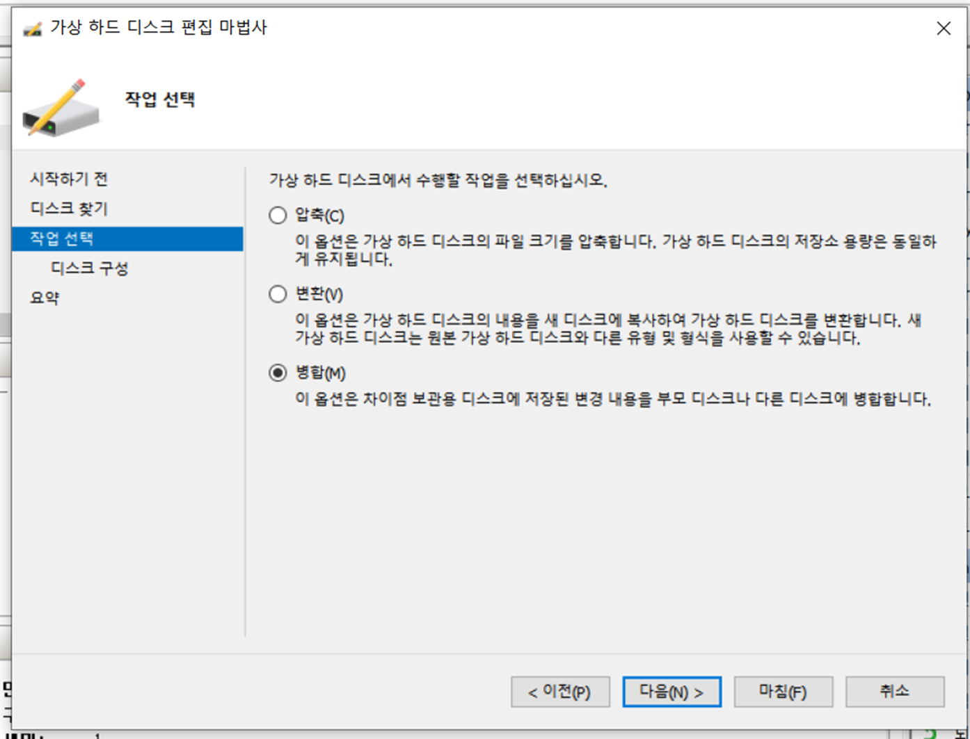 그냥생성하면 VHDX파일로 만들어지고, 나중에 디스크를 병합시킬때 오류가 발생할 수 있기 때문에 VHD 디스크 생성 후 VM에 마운트 시키는것으로 ...
