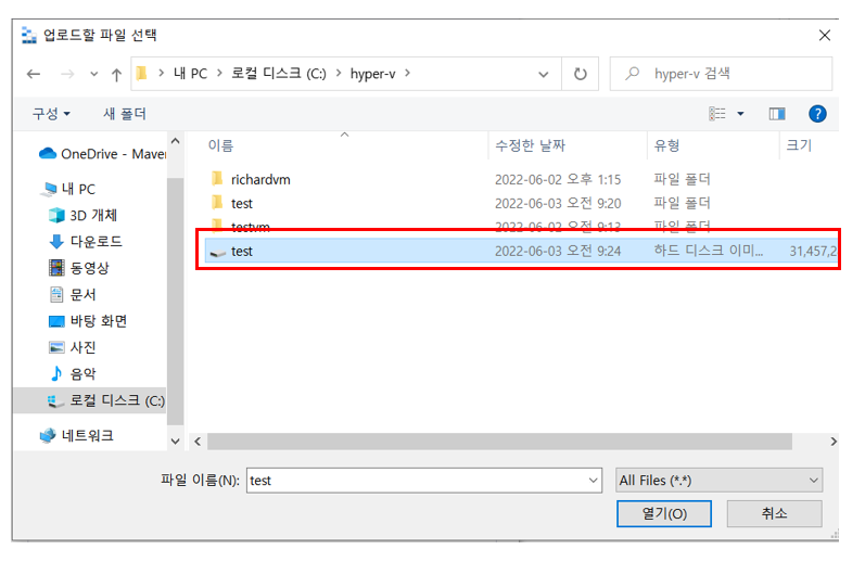 업로드할 vhd 디스크를 찾는다.