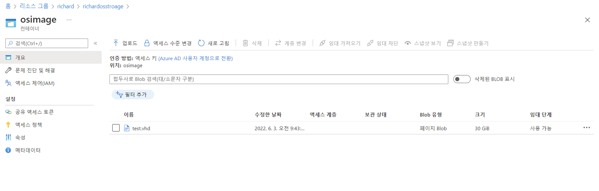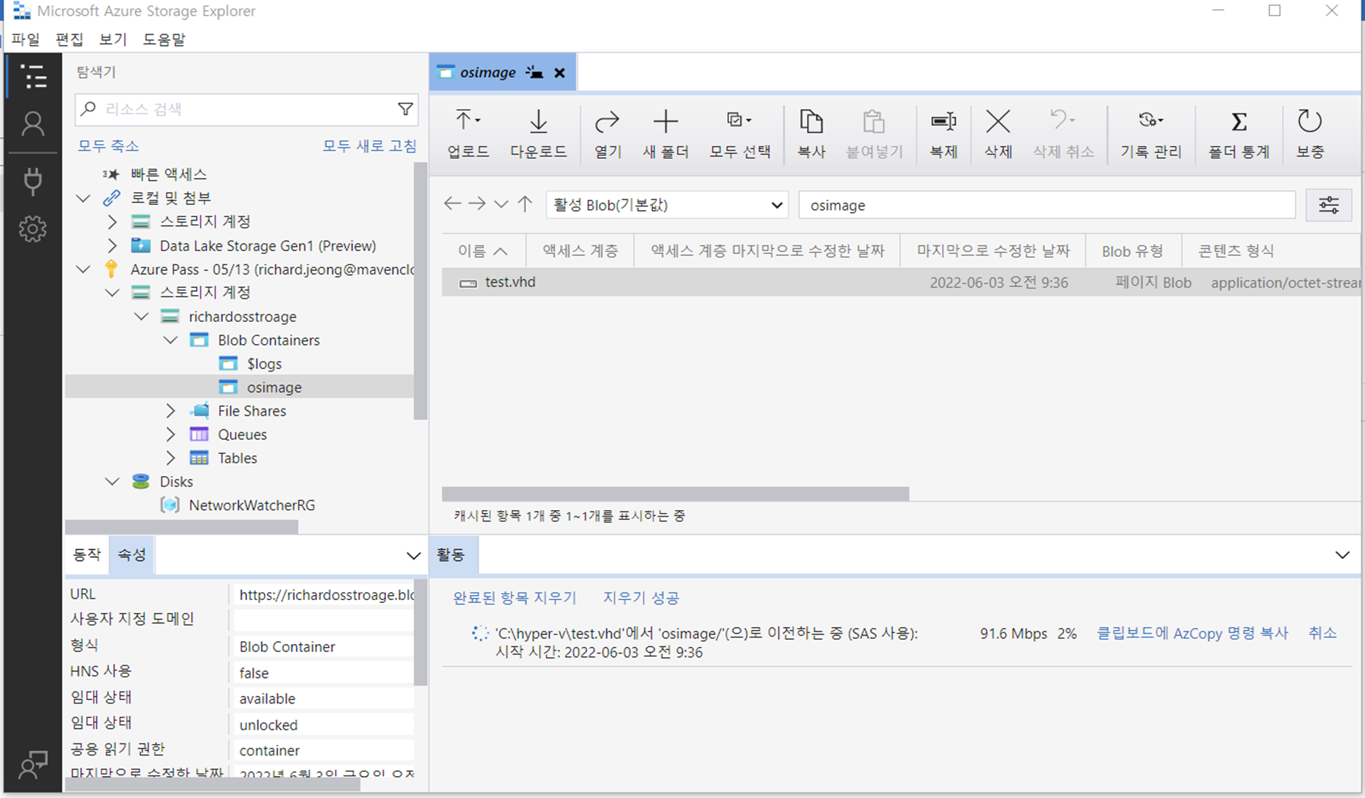 컨테이너에 vhd 디스크가 업로드 되었다.