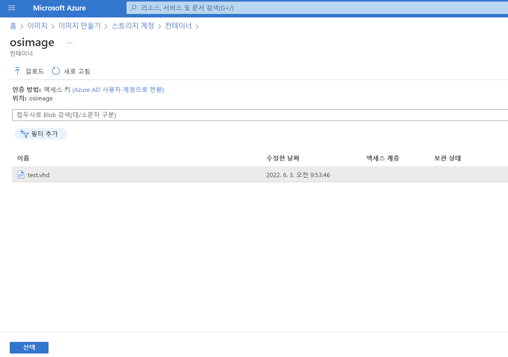 스토리지 계정에 있는 vhd 파일 선택