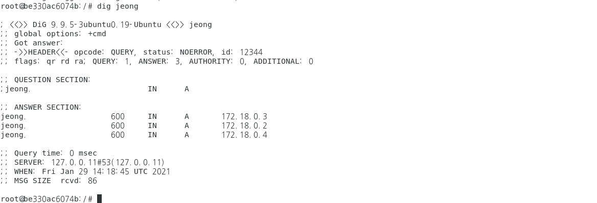 ## 세개의 컨테이너에 접근할 컨테이너를 생성한 뒤 jeong 이라는 호스트 이름으로 ping을 해보자