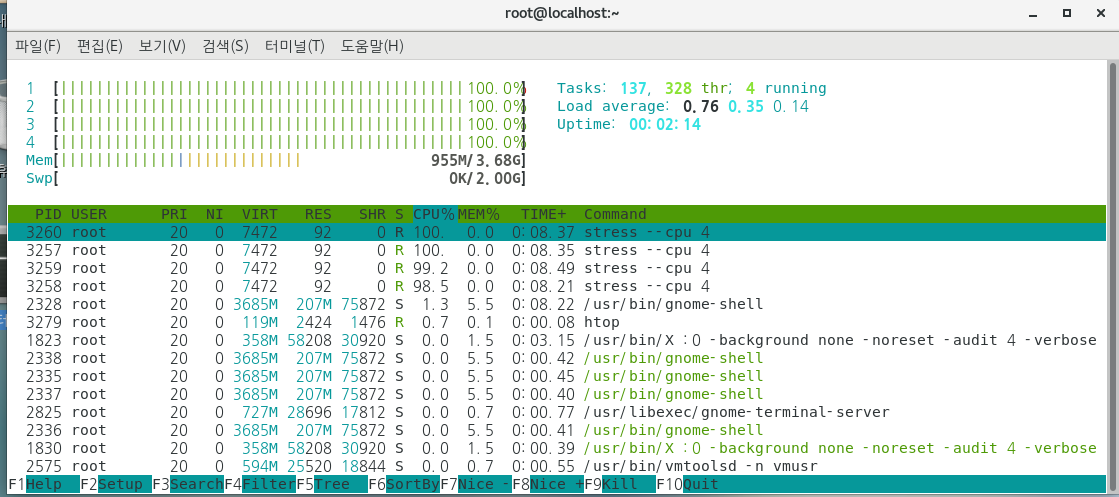 htop 을 이용하여 현재 cpu 사용량을 측정할 수 있다.
