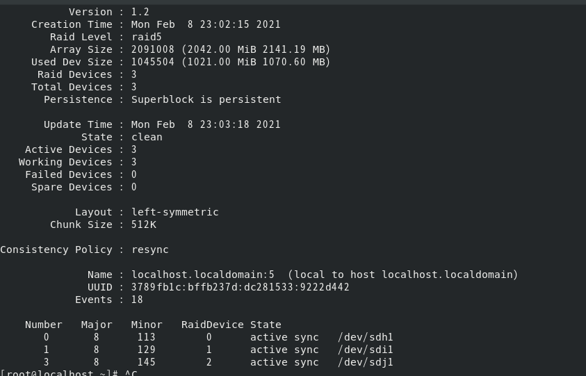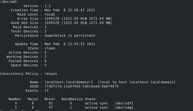 mdadm --detail /dev/장치이름 으로 자세히 확인한다.