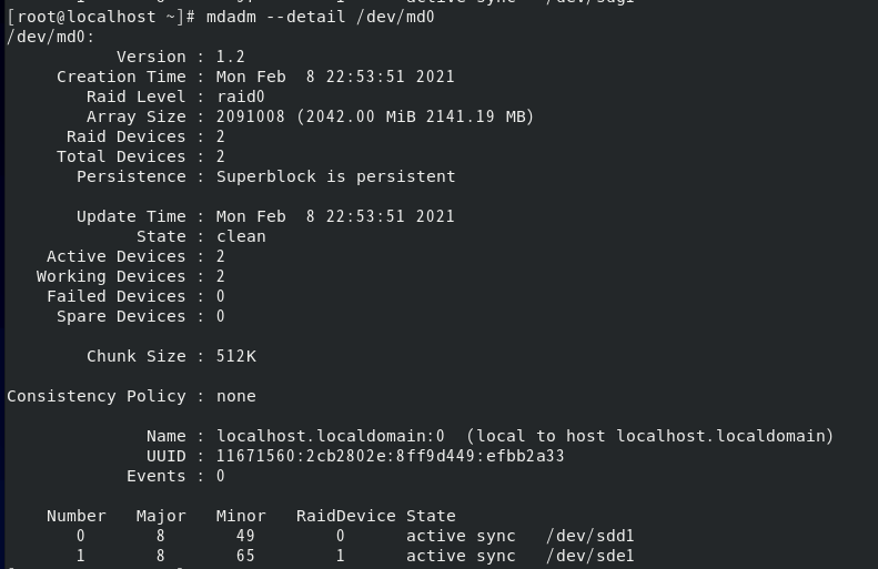mdadm --create /dev/md0 --level=0 --raid-devices=2 /dev/sdd1 /dev/sde1