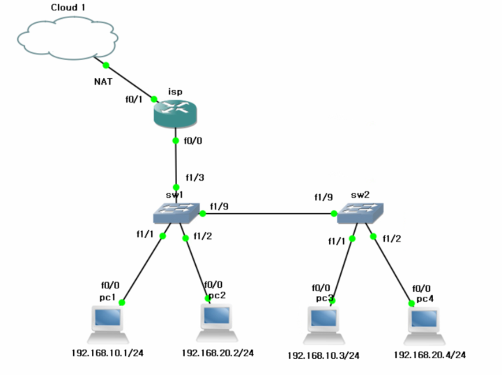 switchport access vlan 10 // f1/1 , f1/9 를 vlan 10 테이블에 넣겠다