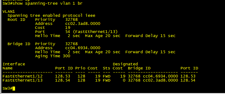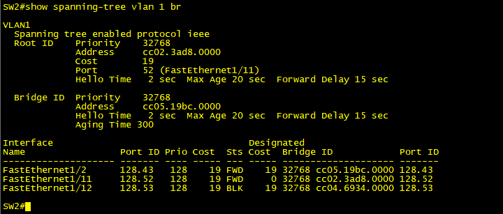 SW1 에서는 우선순위가 32768 MAC은 cc02.3ad8.0000이고