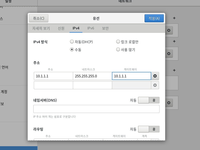 똑같이 리눅스 클라이언트도 ip=10.1.1.0 으로 설정하고 게이트웨이틑 10.1.1.1로 바꿔준다