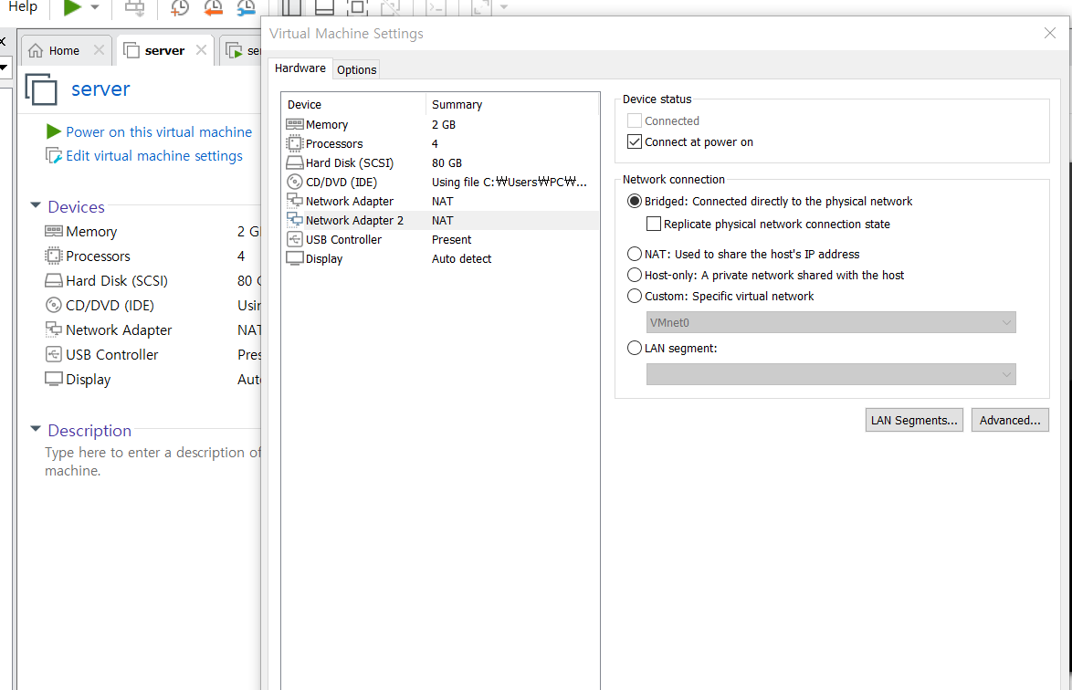 네트워크 카드가 새로 추가 되어있다.