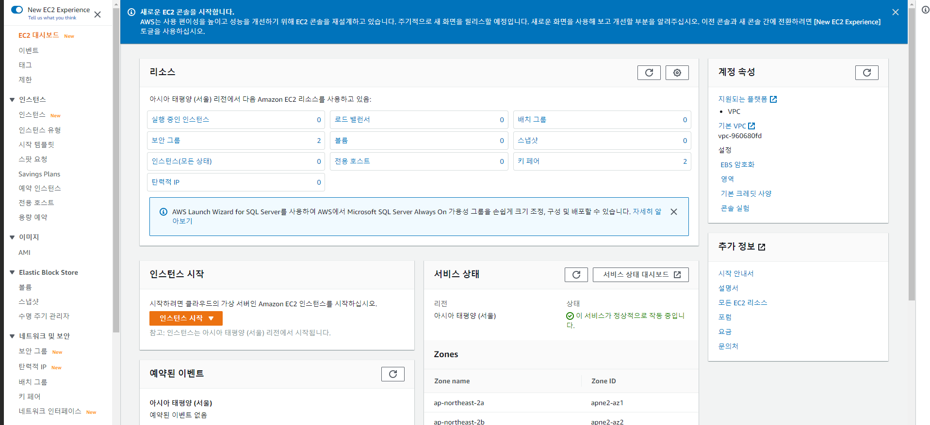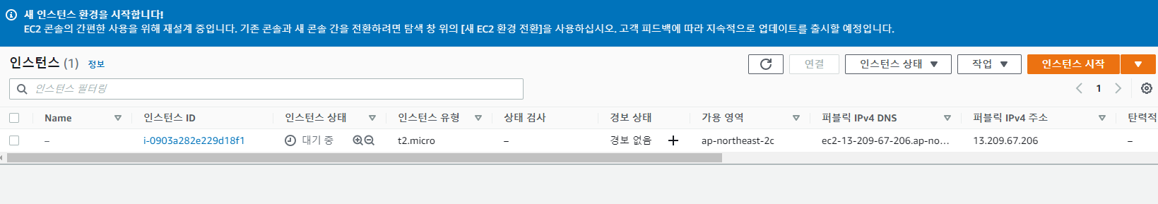EC2 의 대시보드이다. 인스턴스를 만들려면 인스턴스 시작을 누른다.