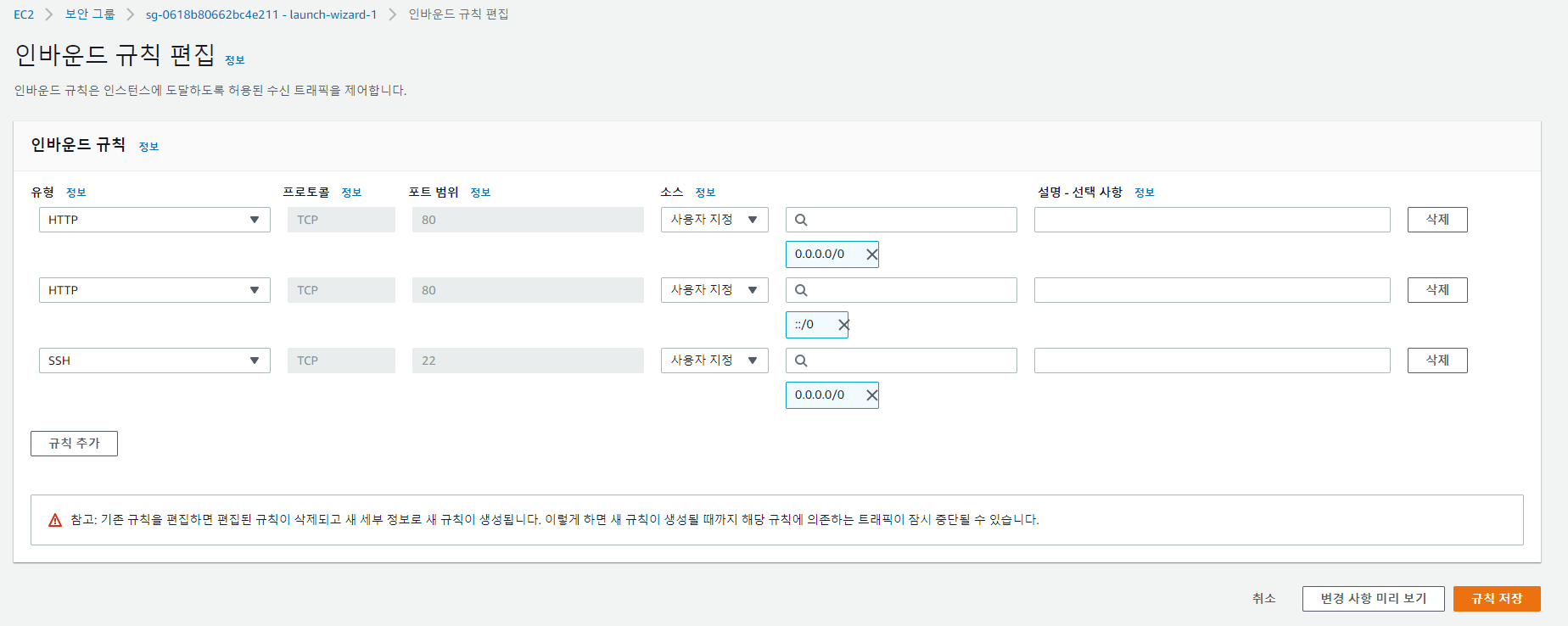 그전에 보안정책에 ssh(22번) , 허용 ip 에 관한 정책설정이 되어있나 확인해본다.