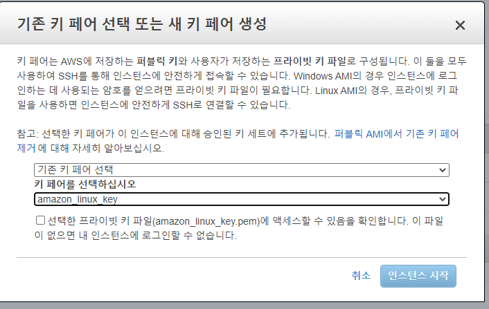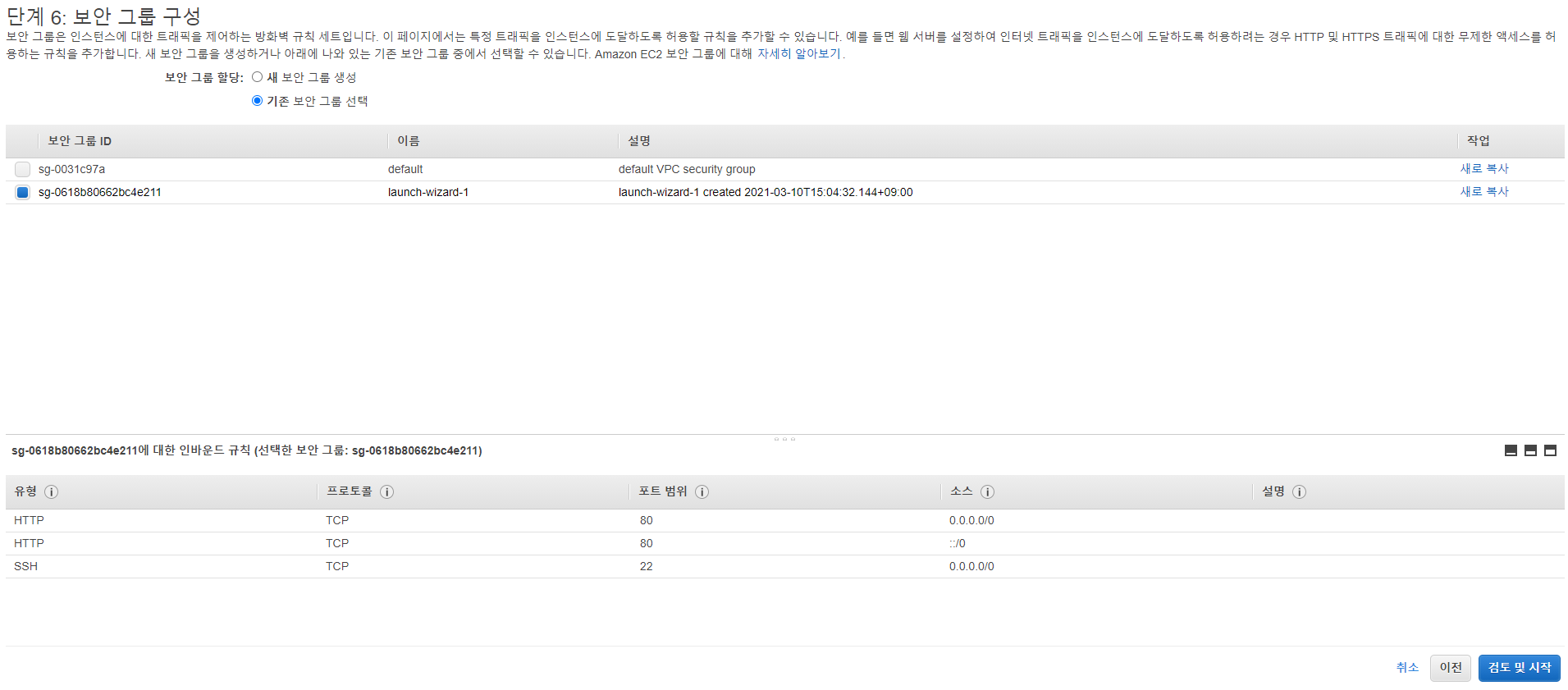 기존 보안그룹을 사용할 수 있고 새롭게 추가할 수 있다. 새롭게 추가하면 키페어를 다시만들어야하니 주의한다.