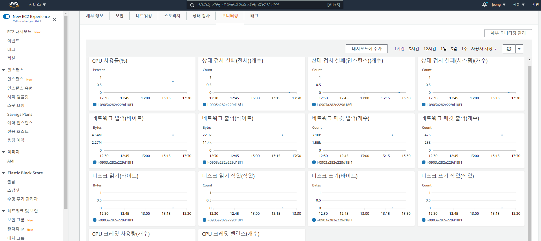 세부사항에서 인스턴스 자원 모니터링도 가능하다.