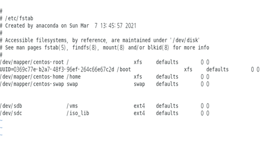 /dev/sdb /vms ext4 defaults 1 2
