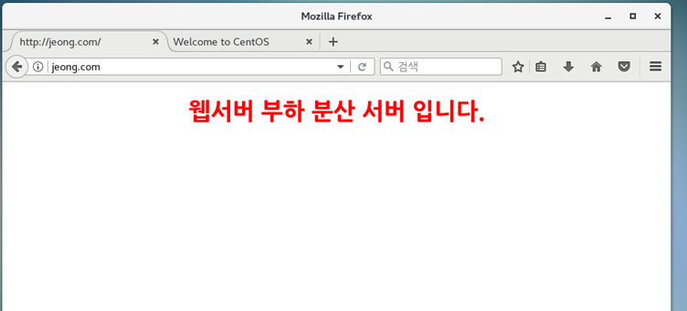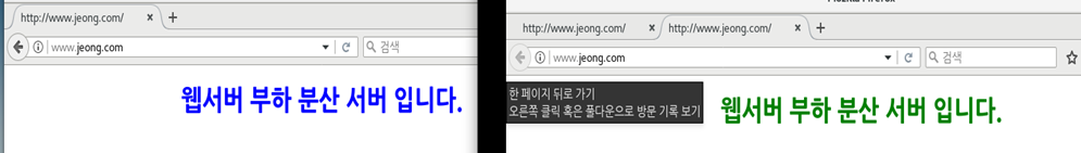 Client 로 가서 www.jeong.com 을 치면 아래 사진과 같이 다른 웹서버가 돌아가면서 뜨게 된다.