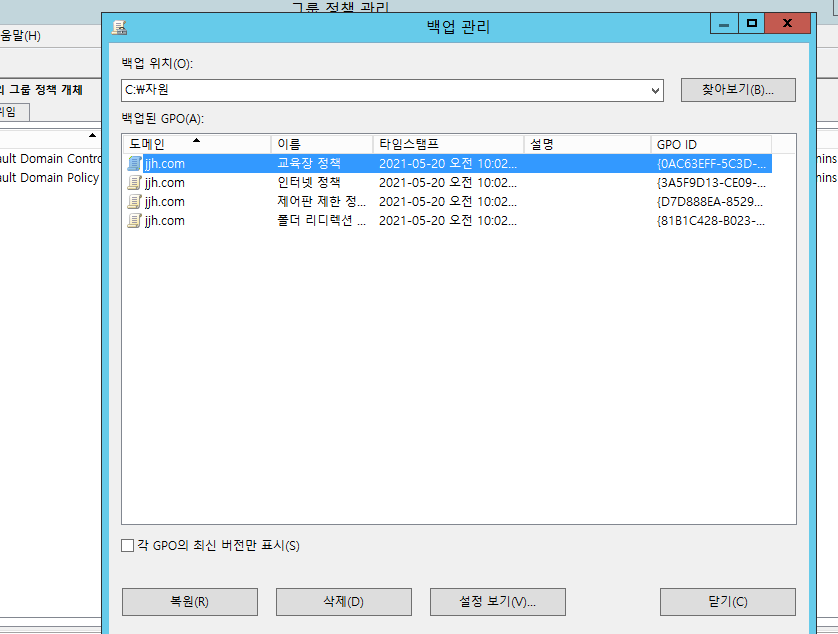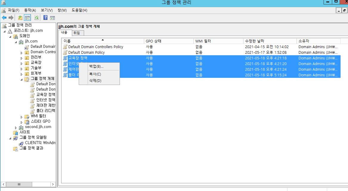 도메인 -> jjh.com -> 그룹 정책 개체선택 후 백업 할 정책을 클릭하고 오른쪽 마우스