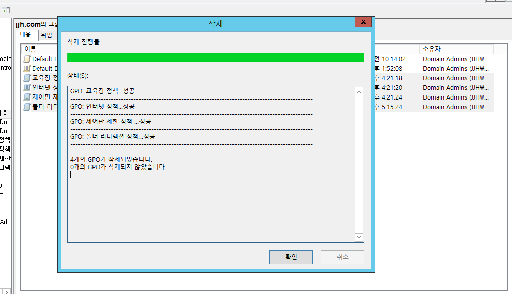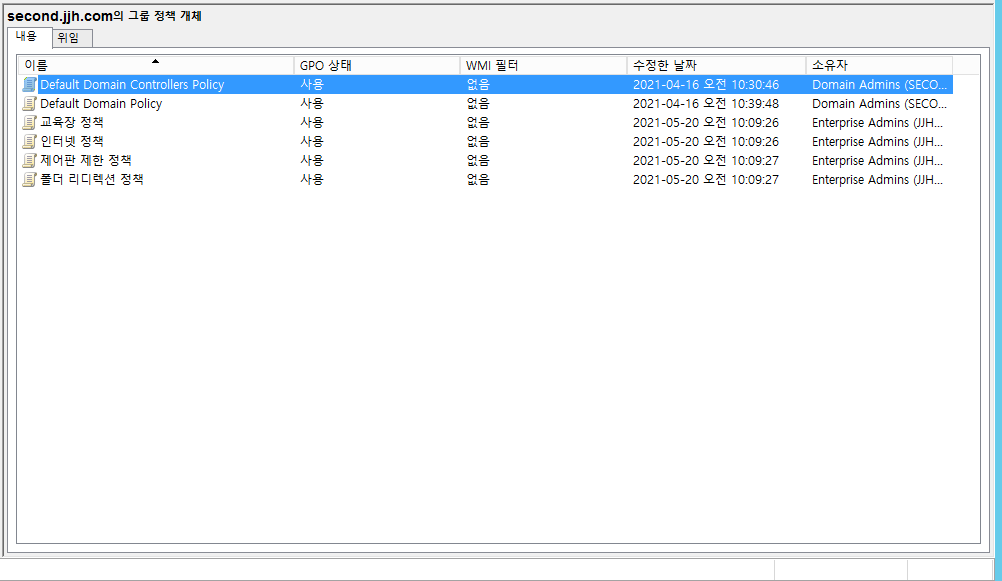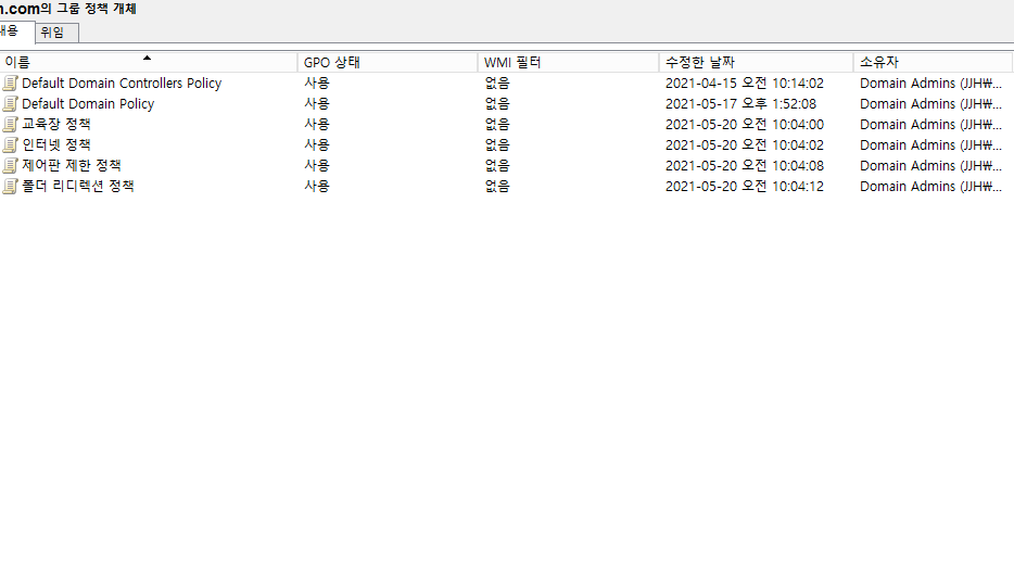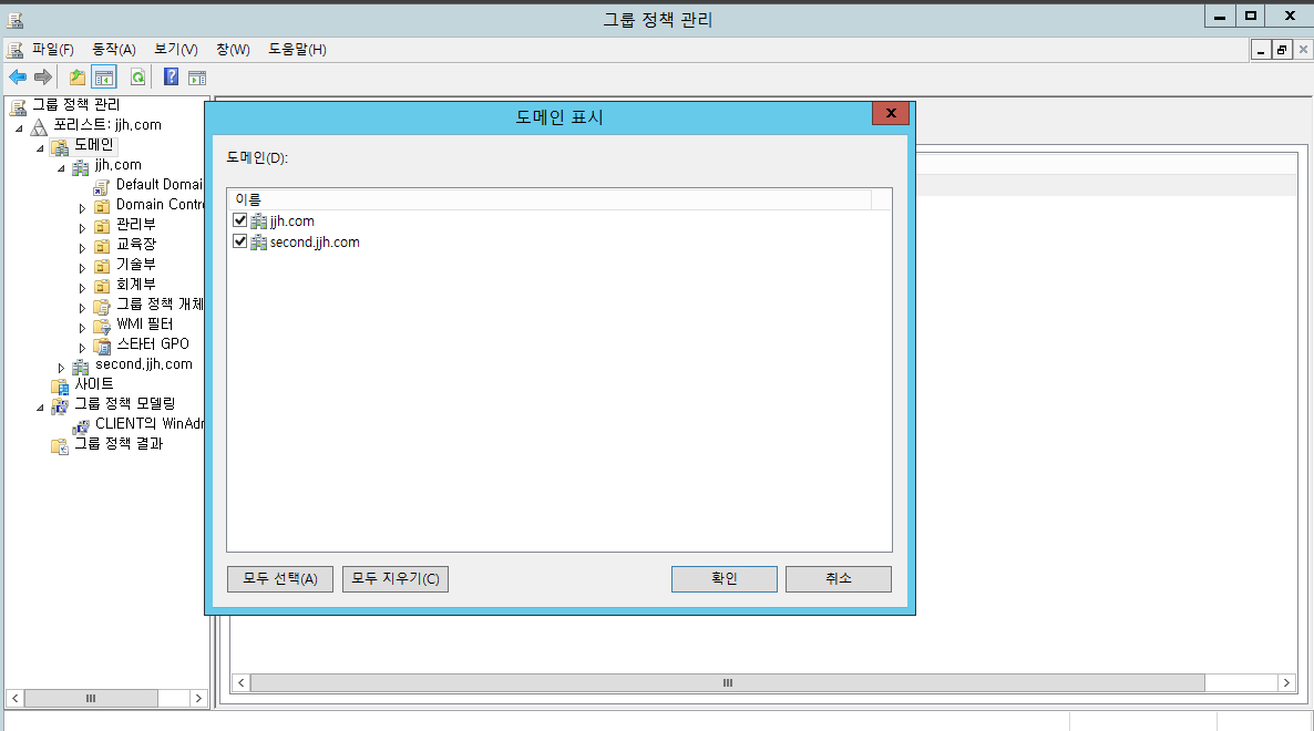 도구 -> 그룹정책관리 -> jjh.com 도메인 클릭 -> 마우스오른쪽 버튼 -> 도메인 창 표시