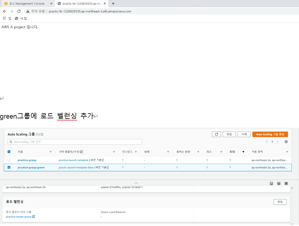 4.로드밸런서에 그린 그룹을 등록 기존 그룹과 , 그린 그룹 인스턴스들이 모든 요청을 나눠서 처리한다.
